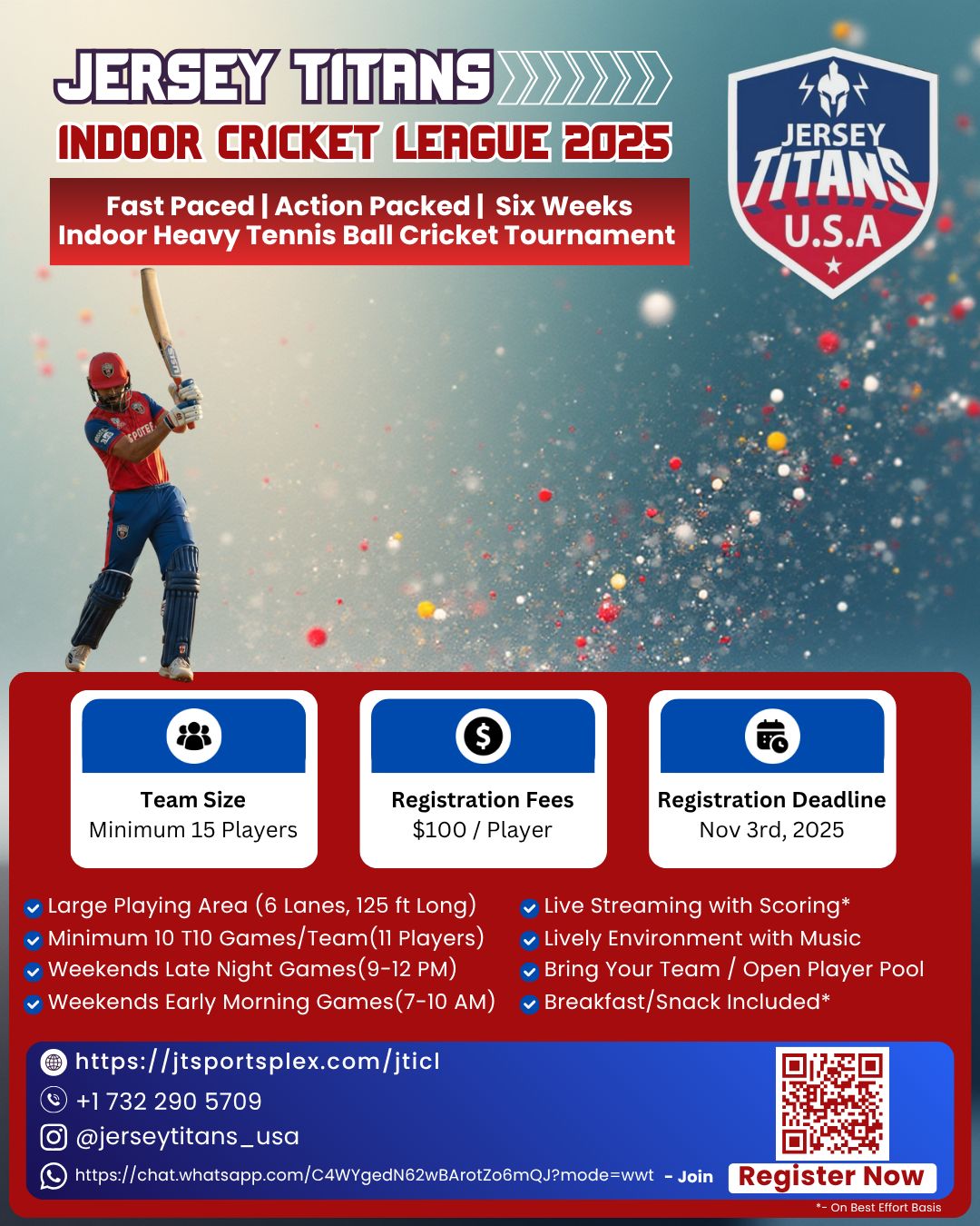 Join the exciting Jersey Titans Indoor Cricket League, a fast-paced six-week tournament with live streaming, included breakfast, and neutral umpires. Sign up now to secure your spot!